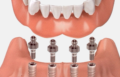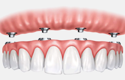 치아가 하나도 남지않은 완전무치악의 경우 2~6개의 임플란트를 식립하여 똑딱단추와 같은 원리의 장치에 연결하여 유지되기 때문에 빠지거나 하는 문제가 거의 없으며,자연치에 비해 80%정도의 저작력을 가지게 되므로 음식을 드실때에도 불편함이 거의 없습니다.